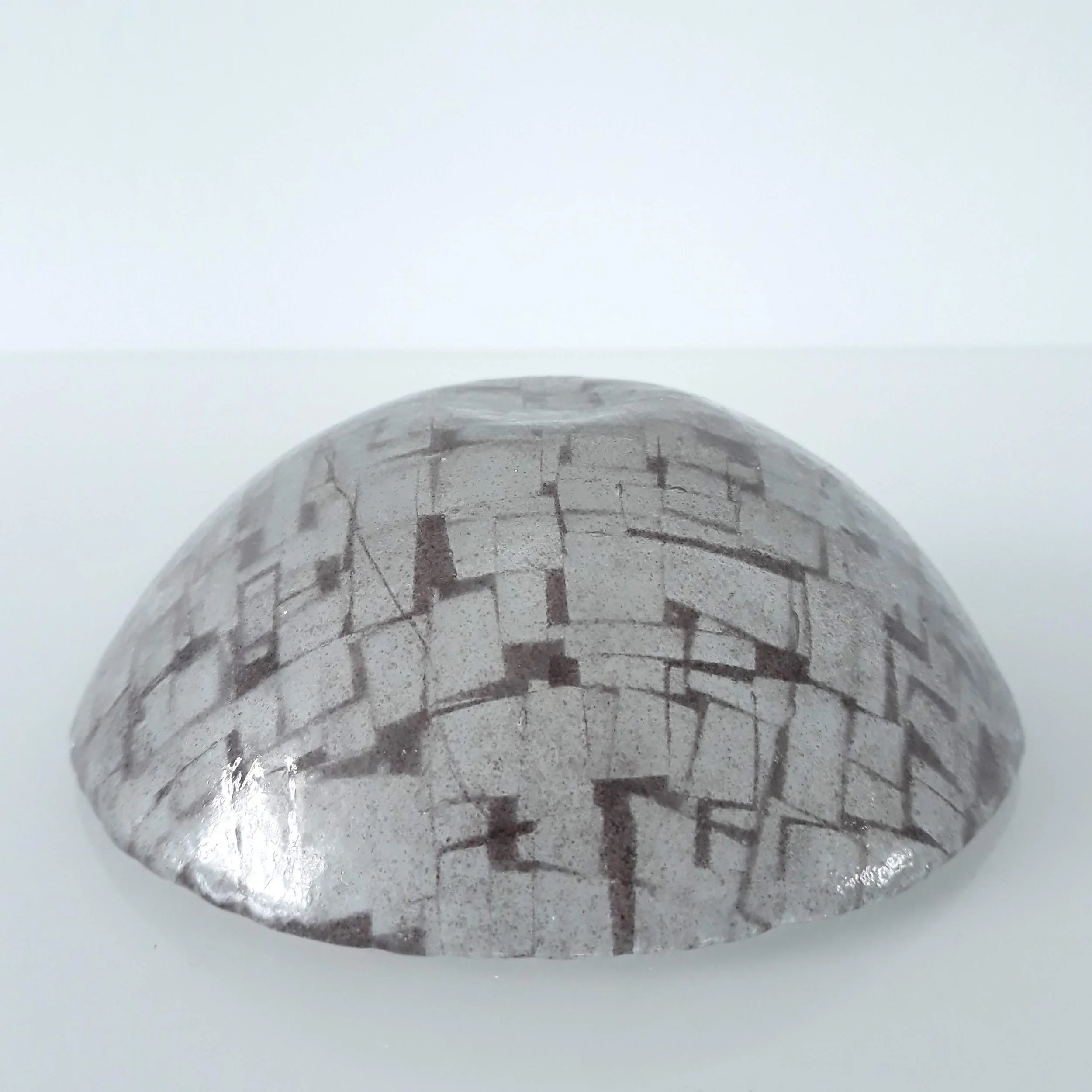 Intricate fused glass inlay bowl in grey brown made with repurposed glass.